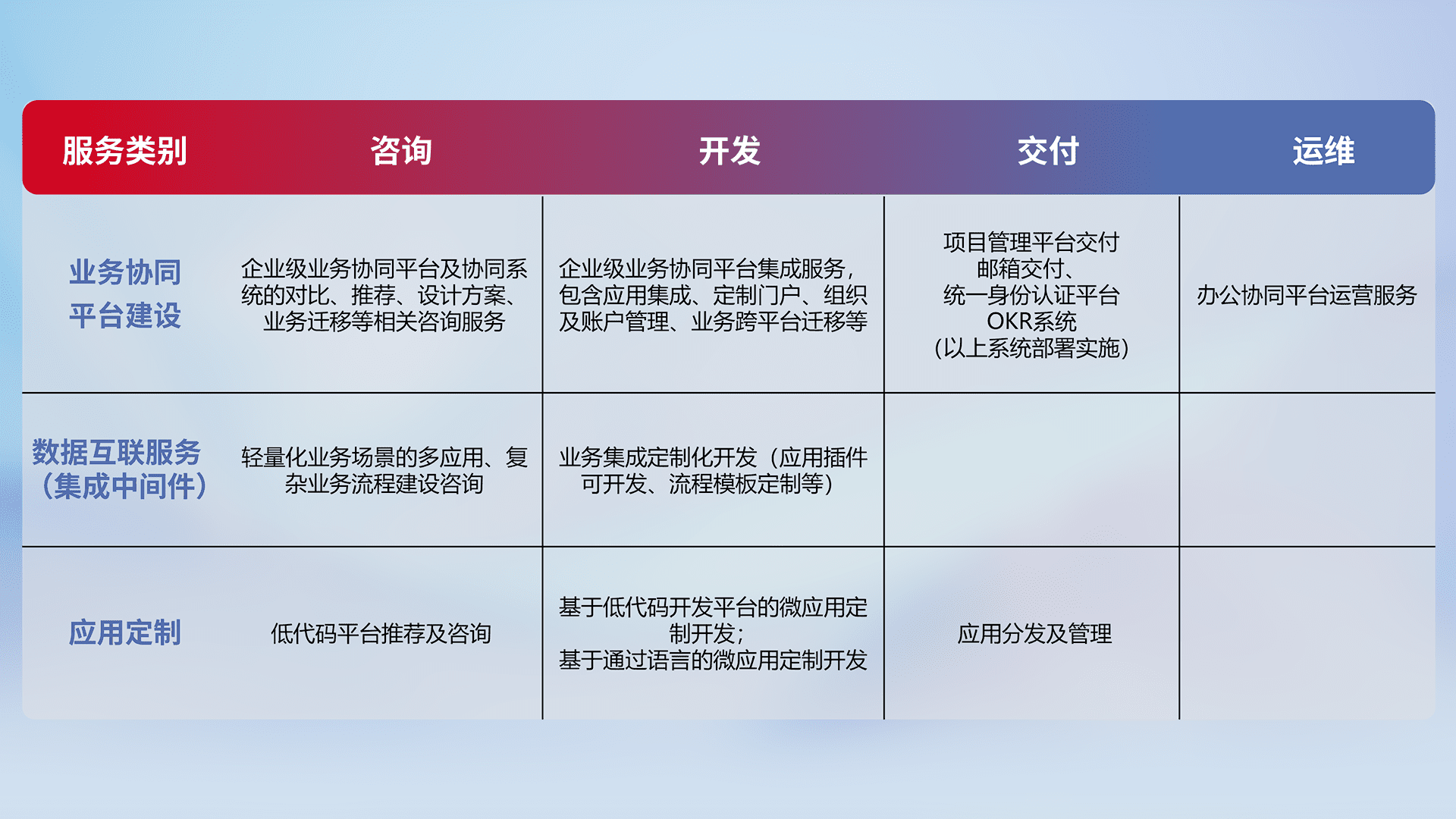 针对钉钉、、企微、、、、IDaas等平台级产品提供产品的规划、、方案、、交付、、定制化开发等服务,,实现如统一协同办公、、、智能客户服务、、、混合会议管理、、智能数据查询、、、、等业务场景,,实现数字化转型。。